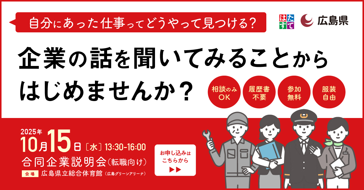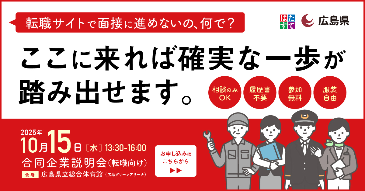 ※働きたい人全力応援ステーション(通称:はたすて)は広島県が設置する就職相談窓口です。