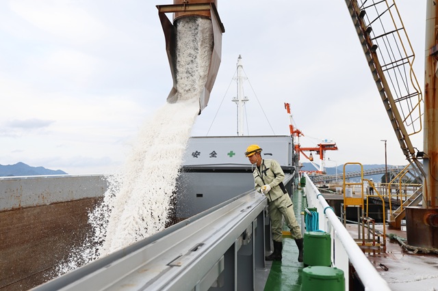 9:00船への積荷役作業開始(以下、2つの作業を交代で担当) ➀ブルドーザー運転:蔵置場に保管された塩をベルトコンベヤに載せる作業。 ②ハッチマン:ベルトコンベヤで運ばれた塩を船倉内に積みつける作業。