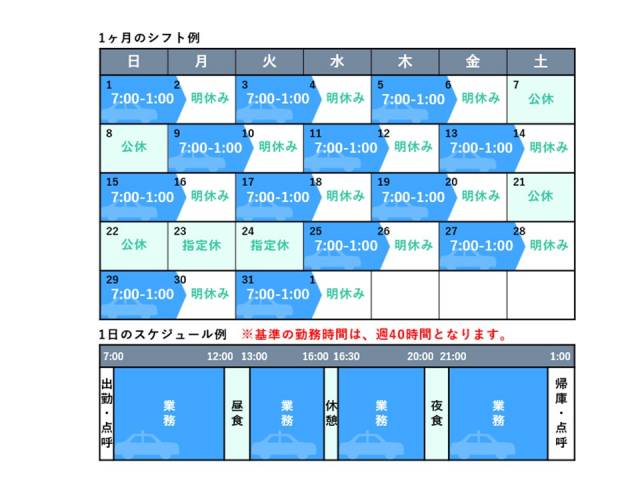 - 1か月単位の変形労働時間制 1日18時間拘束(実働時間15時間) ※週40時間以内 基本例)8:00~翌2:00 短縮日例)8:00~21:00 出勤時間の幅は6時~10時で、出勤の18時間後がその日のその人の定時です。