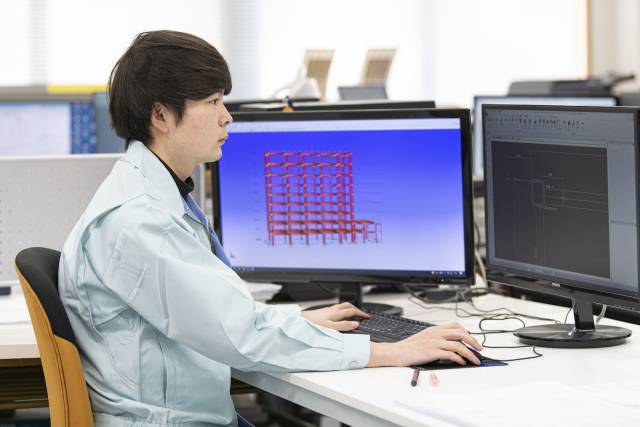 - 鉄骨CAD設計 建物の設計図を基に、鉄骨を加工・組立するために必要な工作図と呼ばれる図面を専用CADを用いて作成します。具体的には、CADソフトに鉄骨部材の詳細な寸法、位置、材料などの情報を入力し、工場での加工や現場での組み立てに必要な図面を作成します。自分が設計した鉄骨が工場で加工され、実際の建物として完成していく達成感はこの仕事ならでは。広島を代表するような大きな建築物にも携わることがあります。 《主な仕事》 ○大手ゼネコンから設計図を受領 ○社内打合せ ○加工組立に必要な詳細情報を記載した工作図を作成 ○質疑書作成 ○工場での加工進捗状況確認 ○製品確認 《キャリアステップ》 入社後:新入社員研修(2週間)を経て現場に配属、CAD操作についての講習を受講 1~2年目:先輩に教わりながら、基礎知識や仕事の流れを把握 3年目以降:成長進度に応じて少しずつ任せられる範囲が増えていきます \先輩からのメッセージ/ 入社するまでは鉄骨に関する知識がまったくありませんでした。最初は図面の読み方も分からず不安でしたが、先輩が一つひとつ丁寧に教えてくれたおかげで、少しずつできることが増えていきました。この仕事の魅力は、自分がパソコン上で描いた鉄骨の設計図が、実際に工場で加工され、建物として出来上がる過程を見られることです。特に、地元広島の大型商業施設や銀行など、誰もが知る建物に関わる機会もあり、「自分の仕事が街の一部になっている」と感じられるのが大きなやりがいです。 経験や専門知識は入社後にしっかり学べる環境が整っているので、未経験からでも安心してスタートできます。コツコツと集中して取り組むことが好きな方には、とても向いている仕事だと思います。 (入社5年目/福山大学/工学部卒)